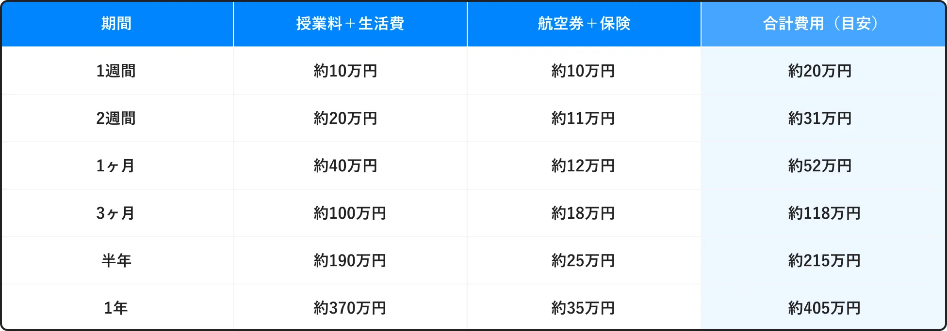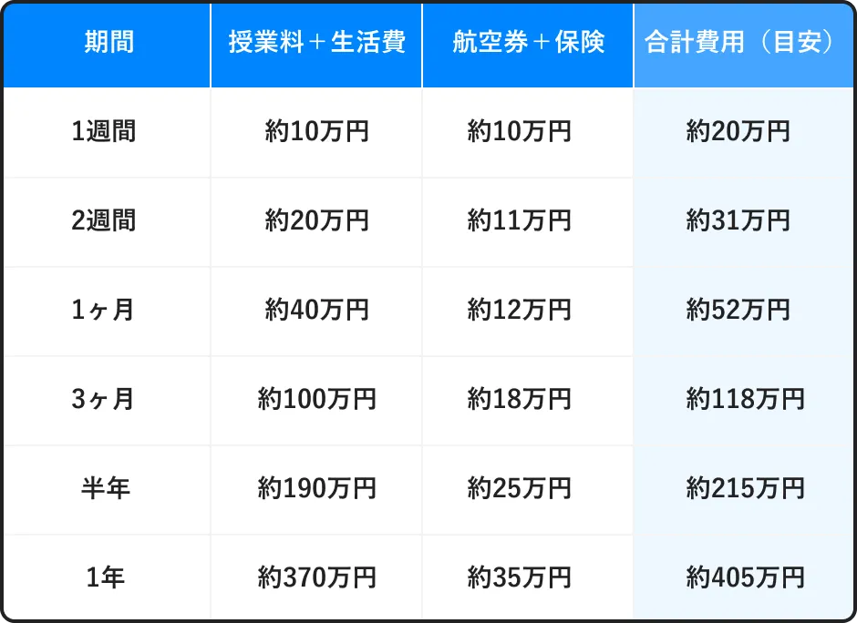 (授業料+生活費:約20万円、航空券+保険:約11万円)