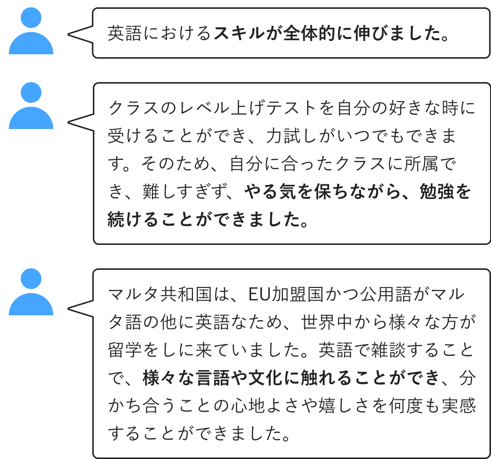 スピノラ・ベイ近くの落ち着いた高級住宅街にあるため、喧騒等が少なく、英語学習に集中できる環境が整っています。また、校長先生は生徒全員の顔と名前を覚えるほど生徒への思いが強く、学校全体を通してアットホームな雰囲気。2階建ての校舎はコンパクトにまとまっており、他のクラスの学生とも距離が近く、クラスを越えて友人が出来やすいのもいいですね!境に妥協せずとも、比較的安い価格でマルタ留学に挑戦できます!