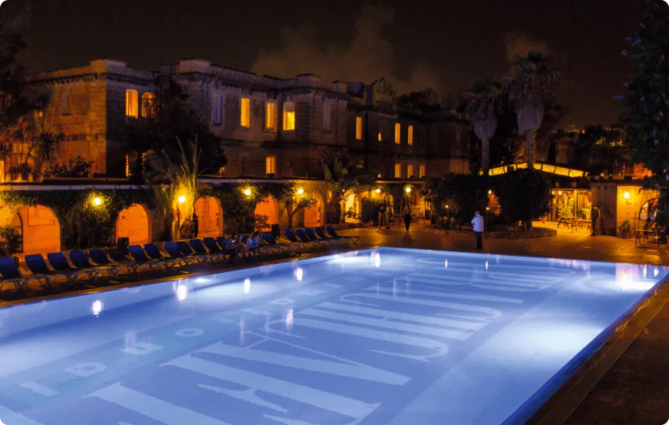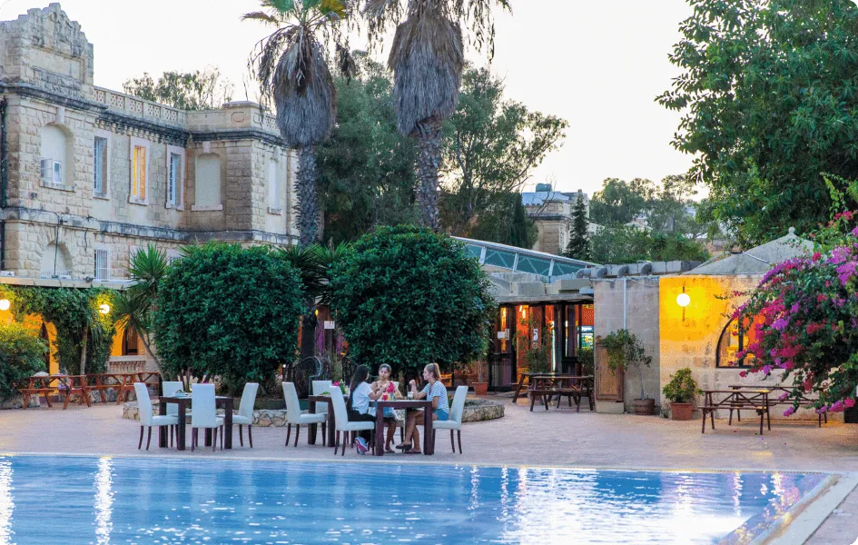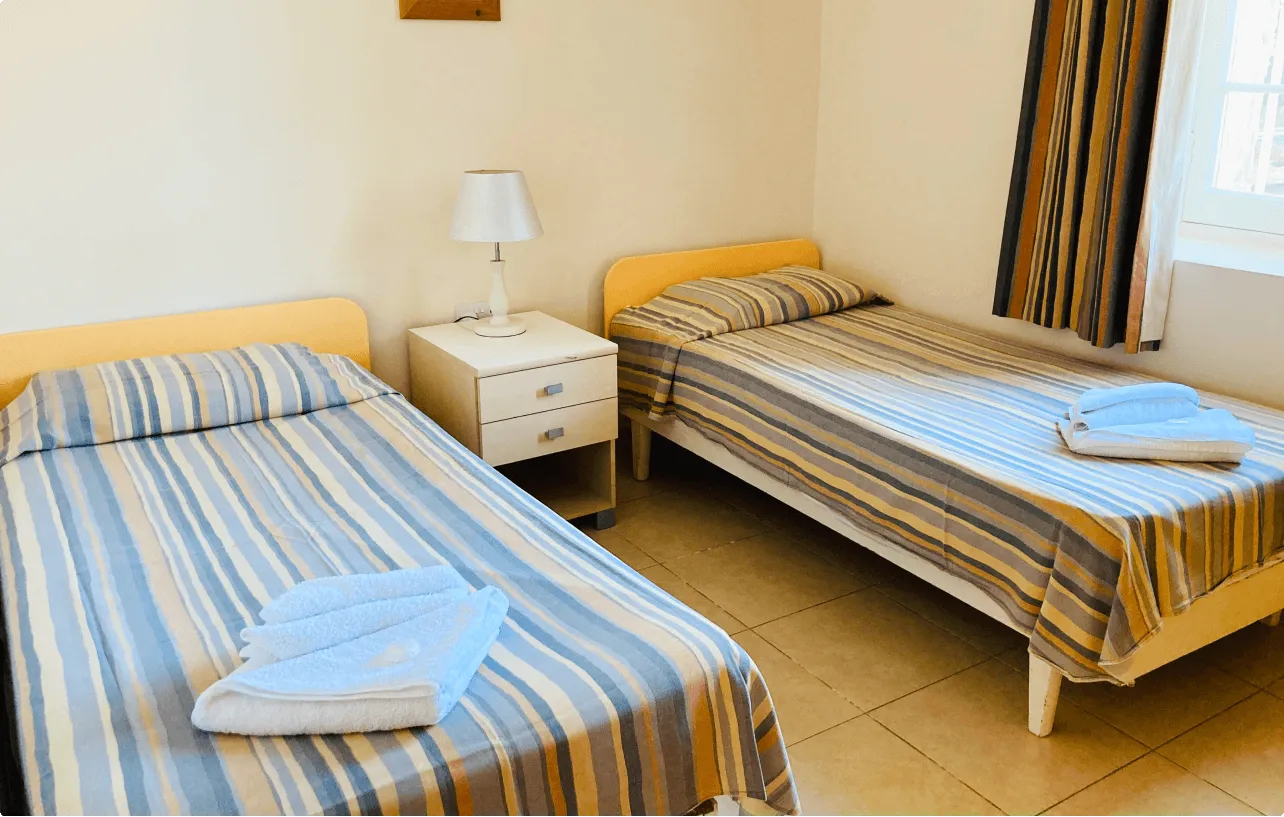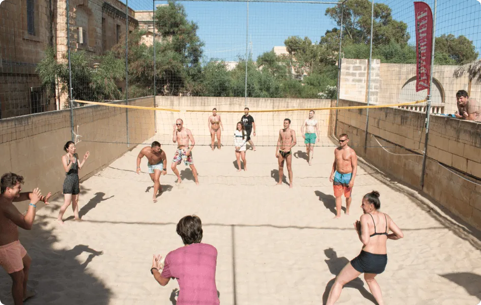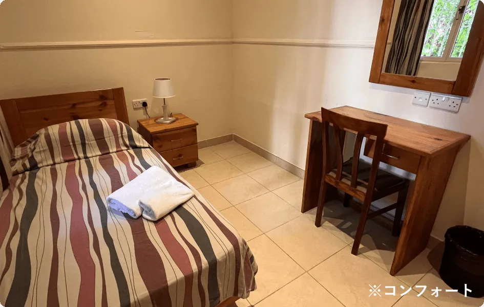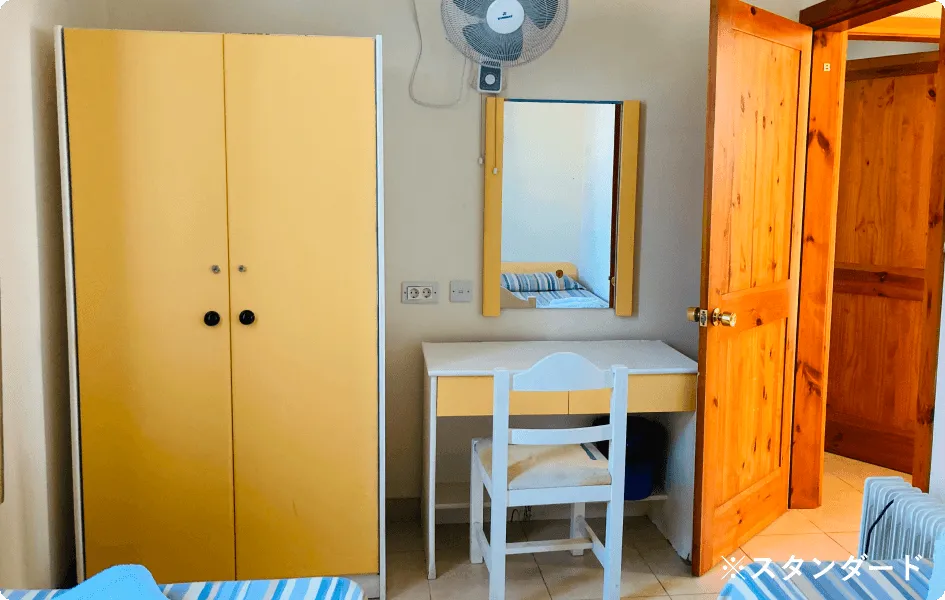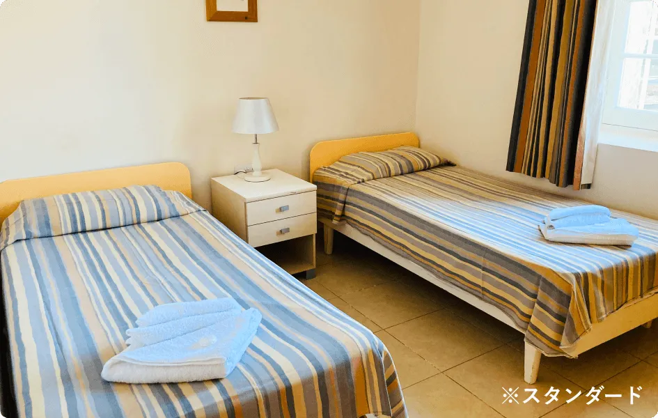 最大の特徴は、なんといってもその施設。地中海らしい石作りの建物や回廊の建築が美しく、緑あふれる豊かな自然に囲まれています。敷地のど真ん中に位置する大きなプールや併設されたプールサイドバーをはじめ、ビーチバレーコートやテラス、ゲーム部屋、ビデオルームが設置されているのも、他の留学生たちと親睦を深めるのに嬉しいポイントです。