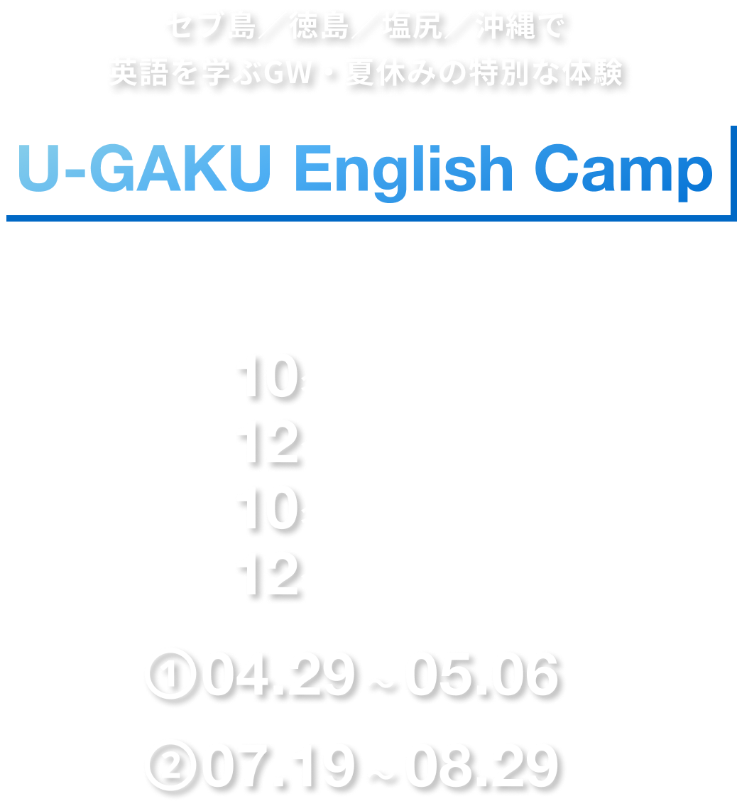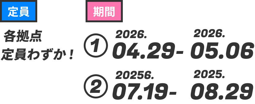 申込期日は特に設けておりませんが、GW・夏の募集は、沖縄・徳島が各12名、塩尻・セブ島が各10名となっておりますのでお早めにお申込みください。