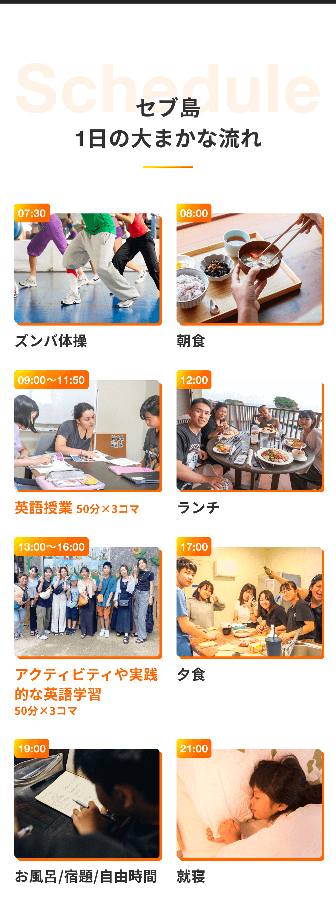 フィリピンで最も観光者数が多いとされるセブ島にある施設は、語学学校と学生寮が併設されているため、現地日本人スタッフの目の行き届く範囲でこどもたちの安全をサポートします。