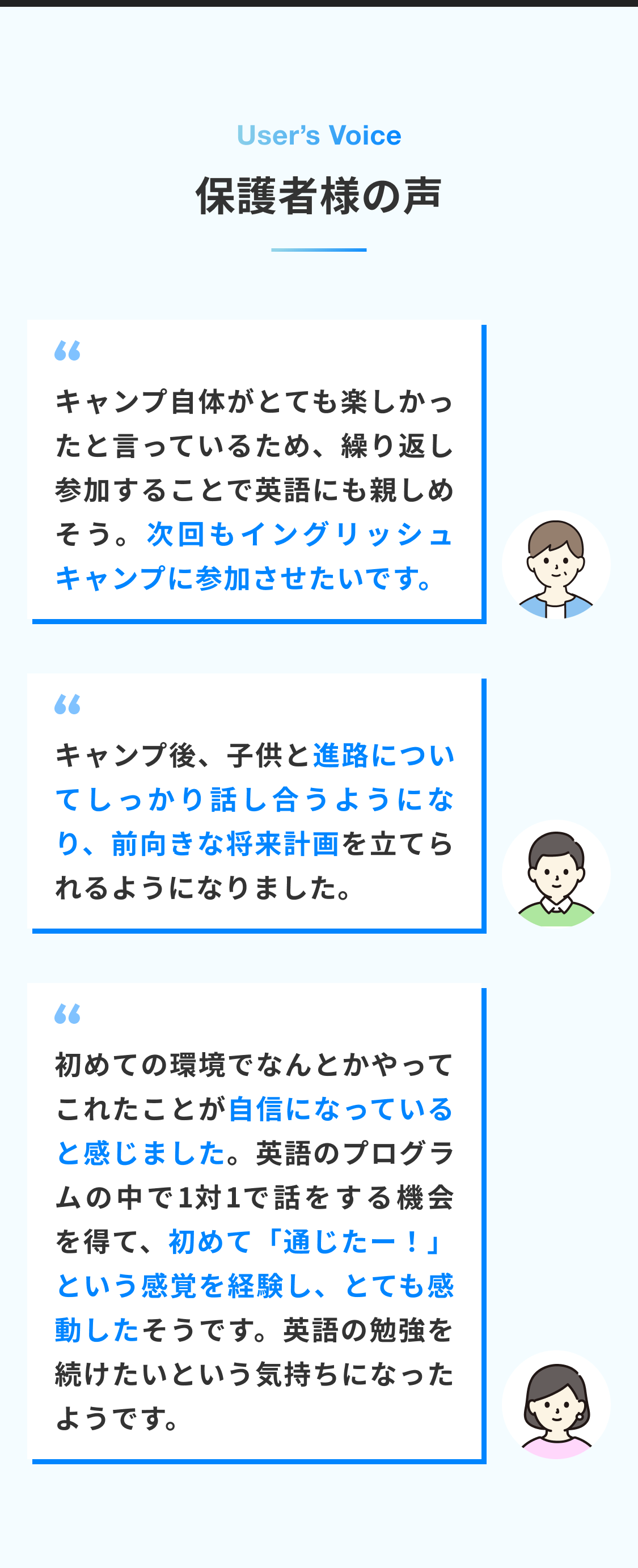 沖縄では、マリンアクティビティや地域ならではの体験を楽しみながら、英語を使う機会を増やしていきます。その一方で、日本国内だからこそ、初めて親元を離れるお子さまでも参加しやすく、保護者の方にも安心して送り出していただける環境です。学習面だけでなく、生活面までスタッフがしっかりサポートします。