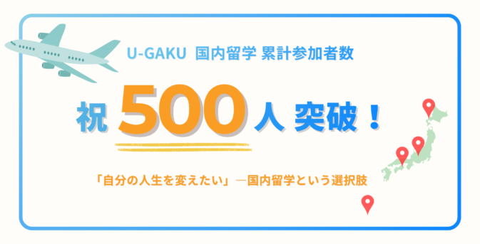 U-GAKUが独自に定義する「国内留学」の価値を改めて整理し、英語力向上にとどまらない自己成長の場として、500名の参加者に新たな一歩を提供してきた実績を示しています。