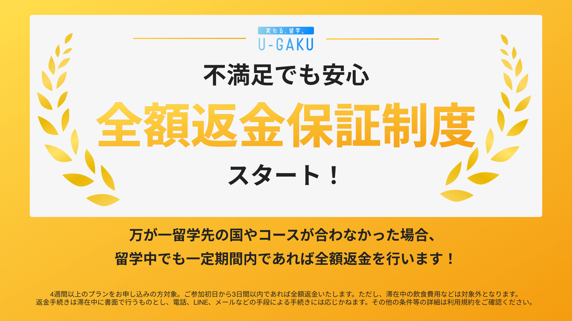U-GAKUは多くの業者のような斡旋のエージェントではなく自社運営のプログラムや施設を提供しています。そのため、食事の提供や日本人スタッフが施設に滞在、現地の病院との提携など親子留学を安心して楽しんでいただけるよう自社運営だからこそできるサポートを提供しております。またプログラムにおいても英語を含めた留学中の目標を一緒に作り、より一人ひとりに合った充実した留学体験ができるようにしております。実際に留学に来ていただいてからは、英語の習得はもちろん、生活や遊びも含めた留学体験として、さまざまなカリキュラムからコンテンツ、アクティビティを柔軟に対応できるようそれぞれにあった形でスタッフや講師がサポートをいたします。