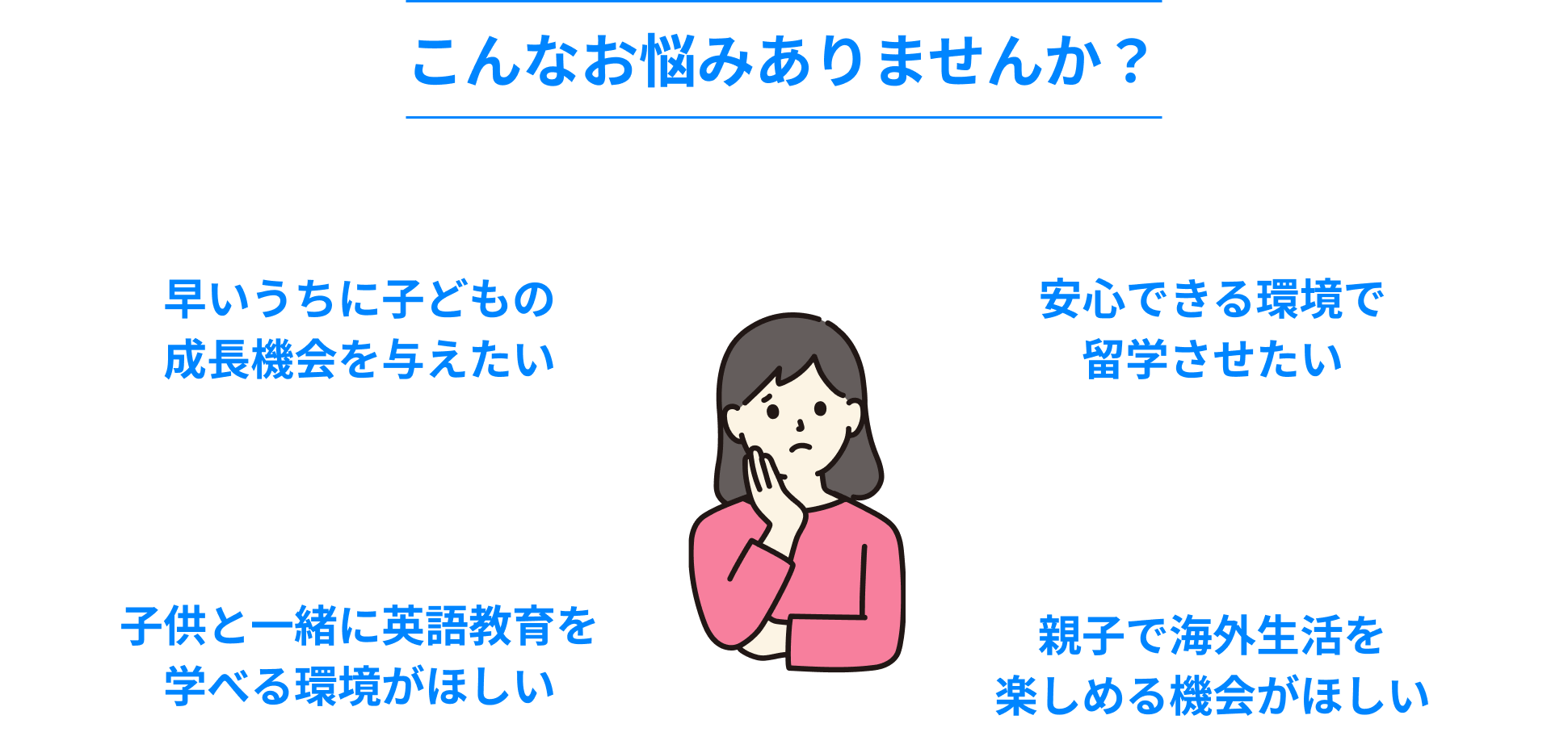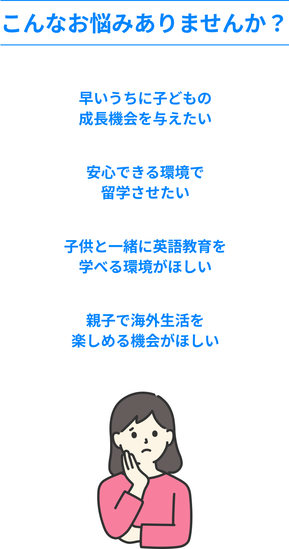 お子様だけでなく親御様自身も異文化を体験し、お子様の将来の可能性を広げながら、親御様も一緒に語学力を磨くチャンスとなります。