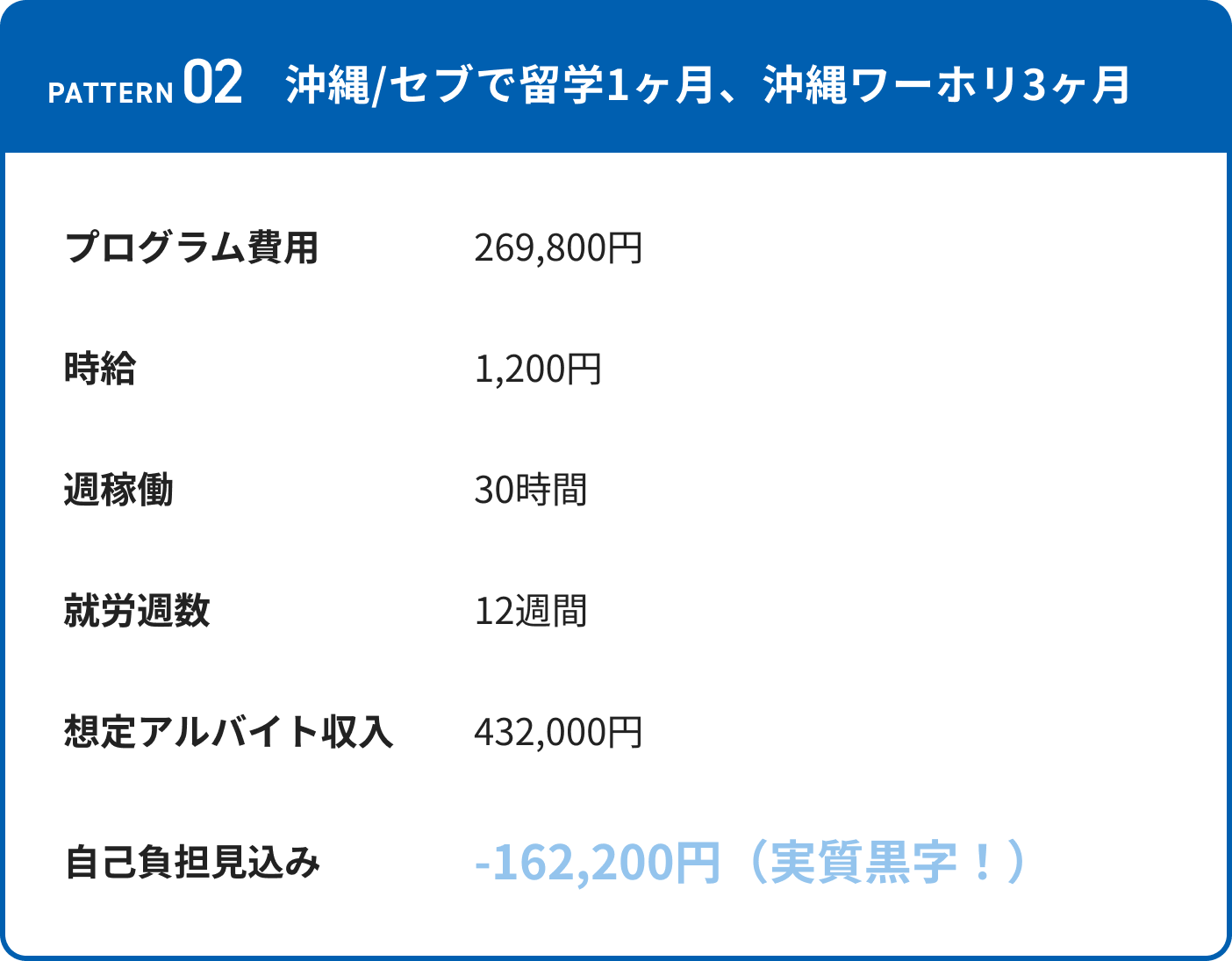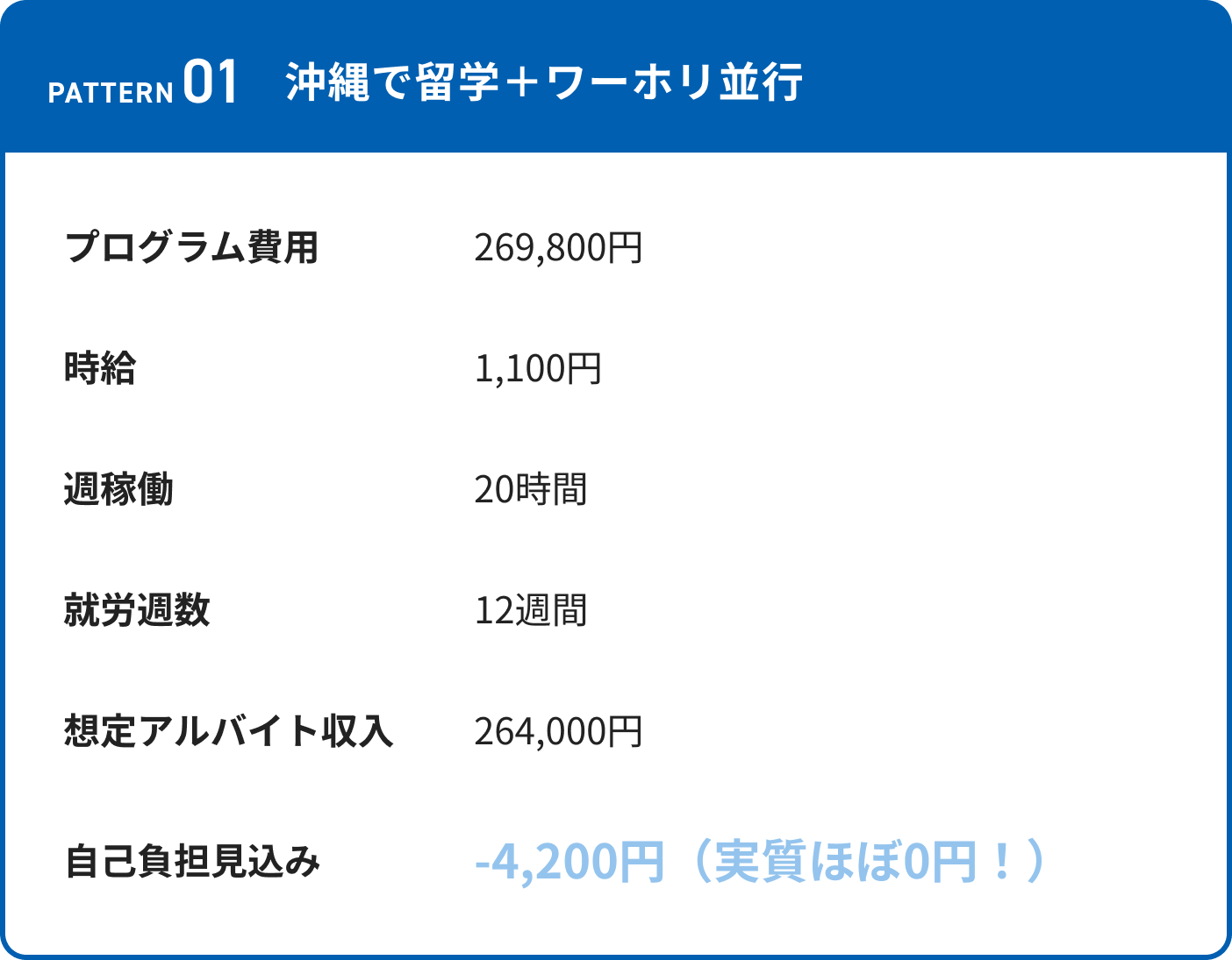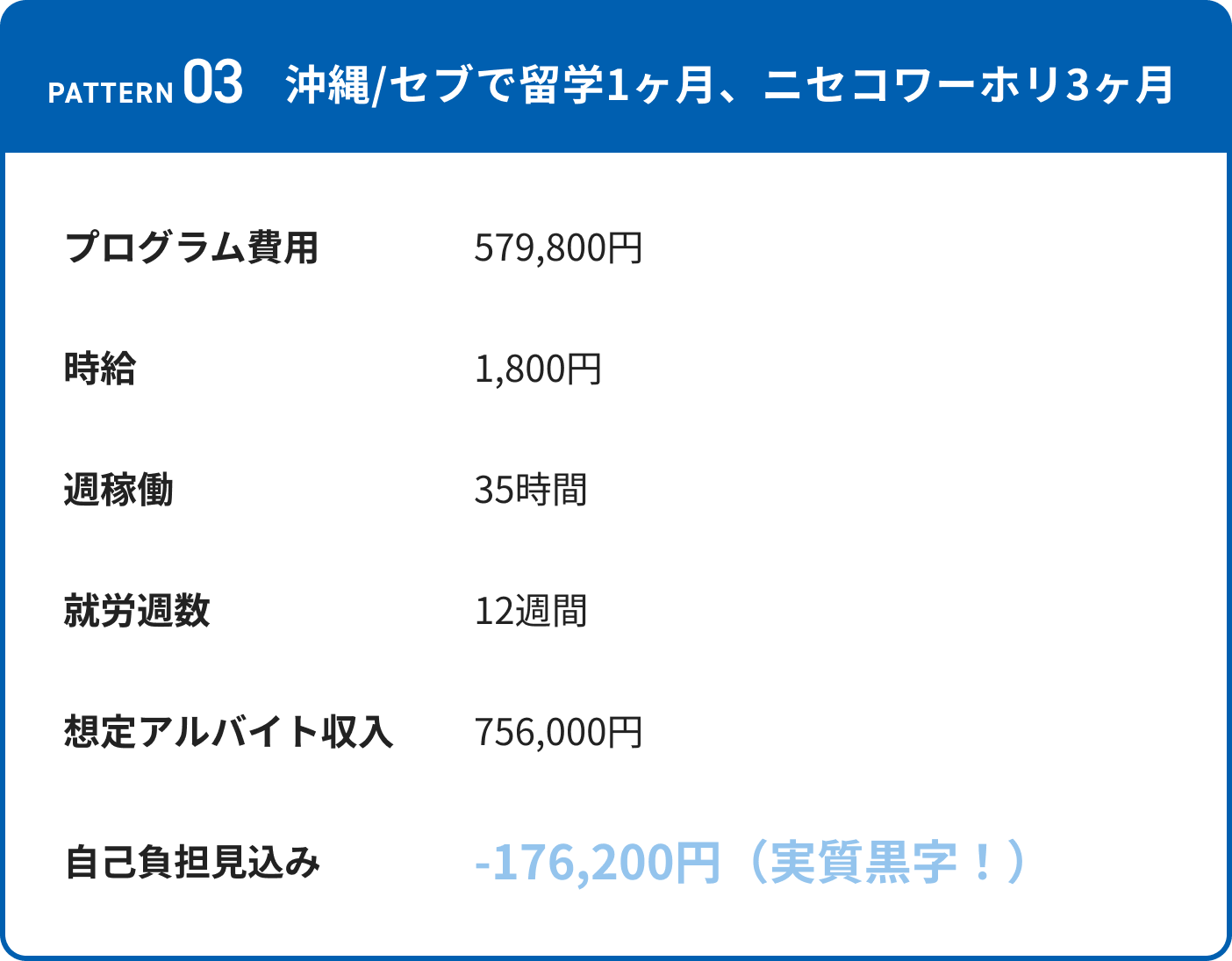 例:留学1ヶ月+就労3ヶ月(住み込み)=アルバイト収入を含めると実質0円程度で参加できます。