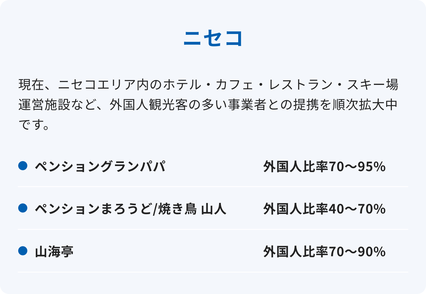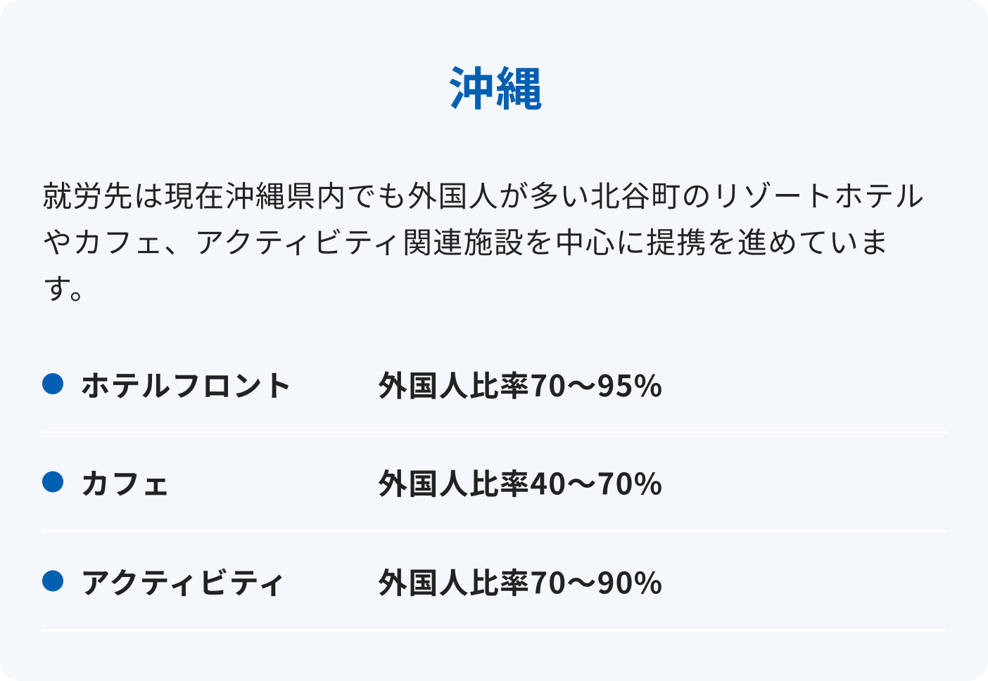 リゾートホテル、レストラン、カフェなどで外国人観光客を相手に英語を使う接客・運営業務が中心です。英語を実際に使う機会が多く、働きながら学べる環境です。