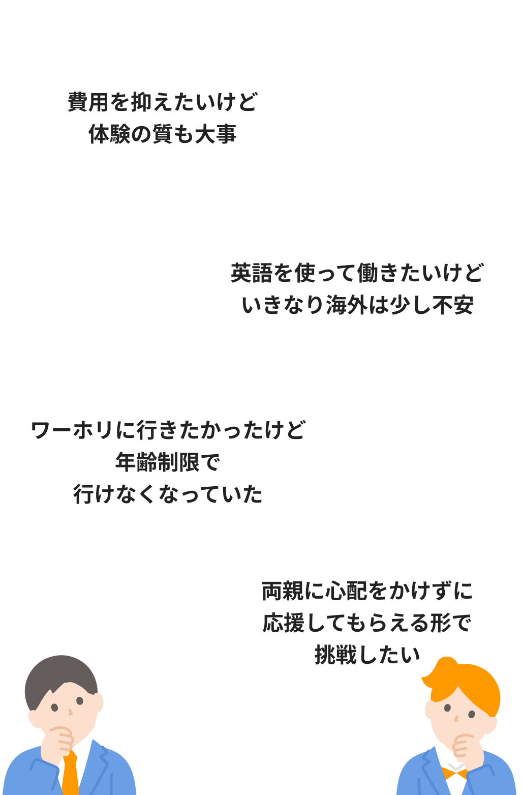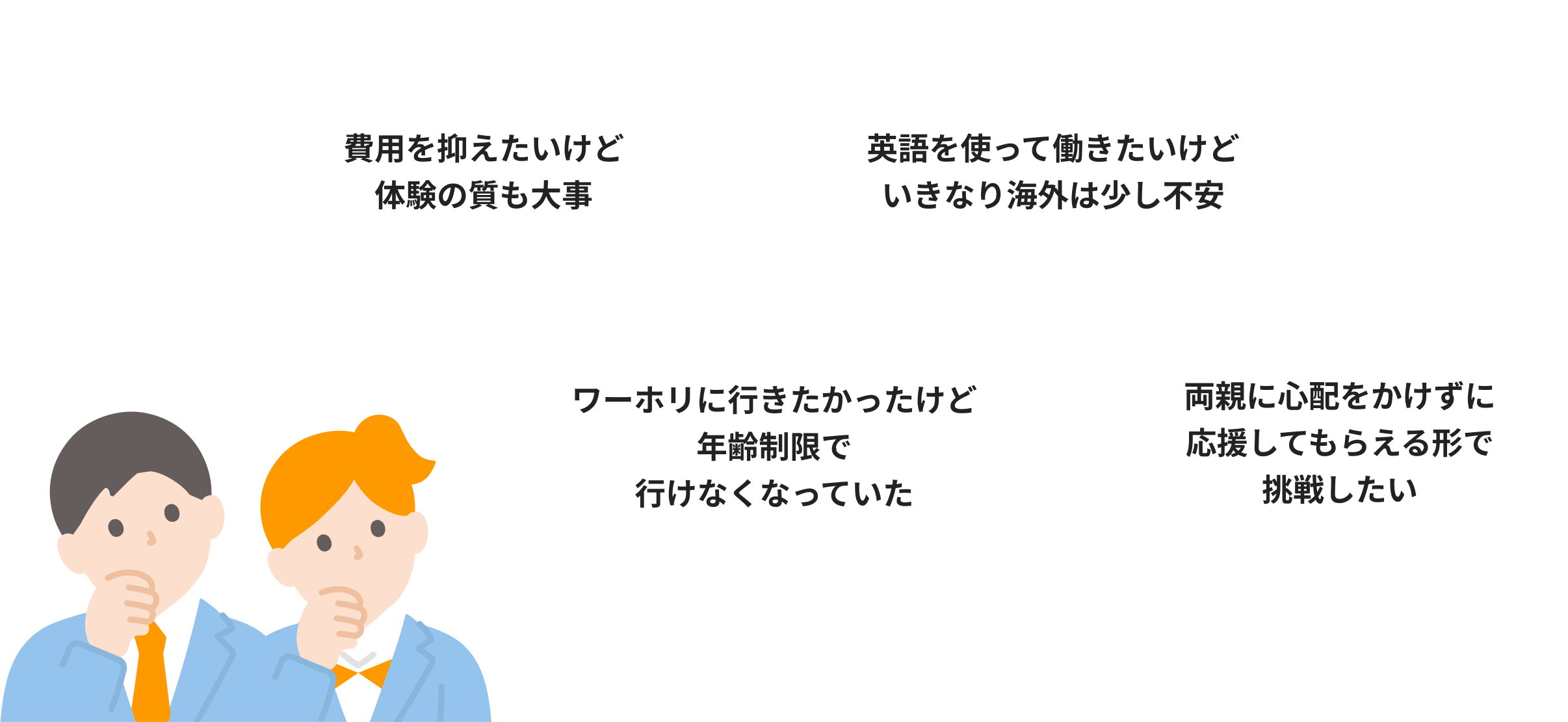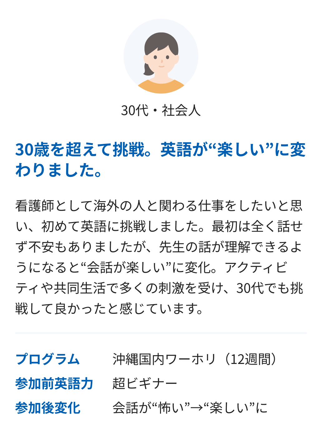 海外ワーホリのような年齢制限がなく、高校生から社会人・30代以降まで幅広く参加可能。初めての留学にも、再挑戦にも選ばれています。