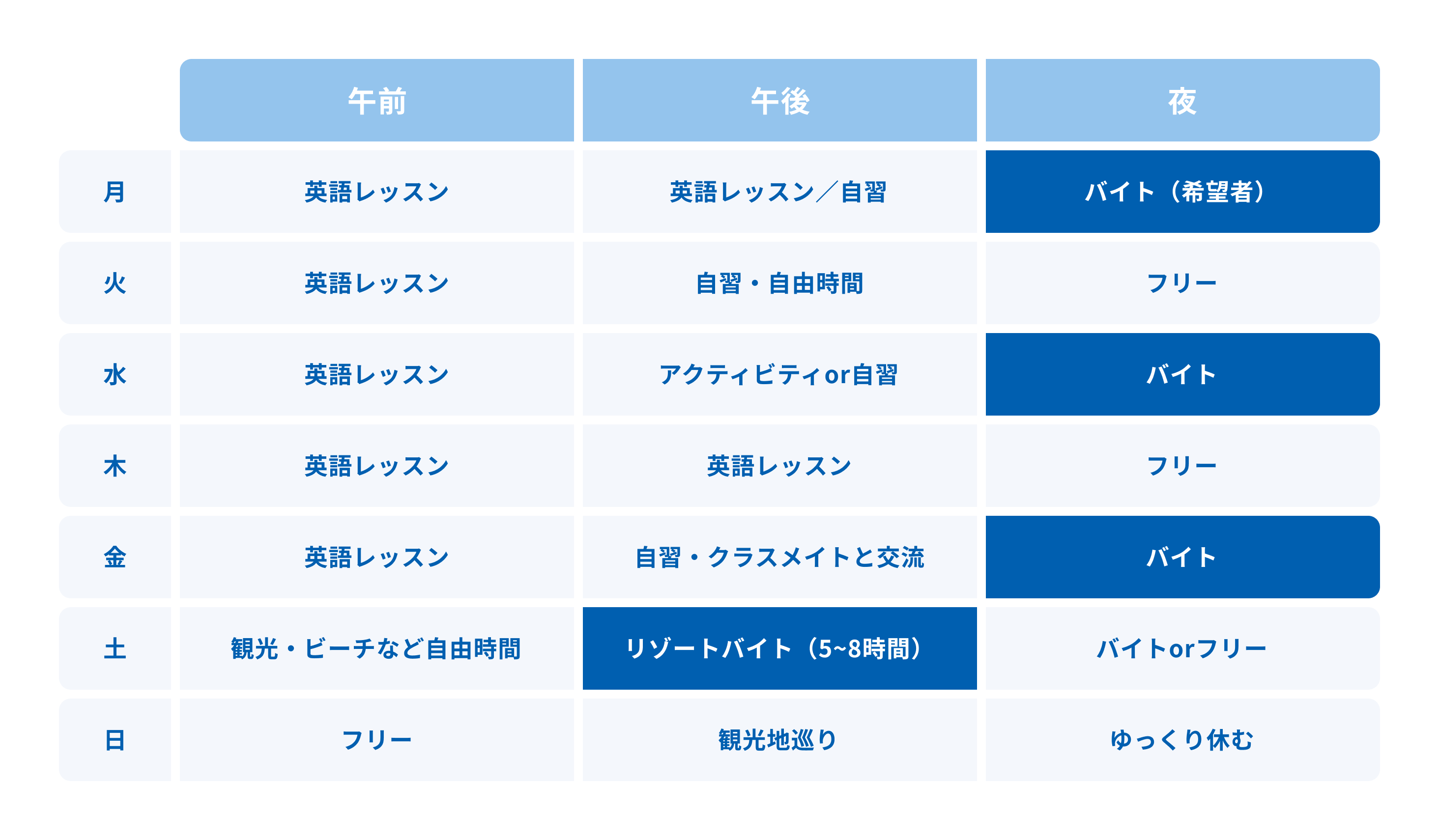 パターン①は留学期間を終えた後、3ヶ月以上の就労を開始します。パターン②は留学と並行しながら週2〜3回の夜バイトや週末のリゾートバイトを継続します。ニセコでの就労は原則3ヶ月以上が基本ですが、沖縄では短期勤務も可能です。