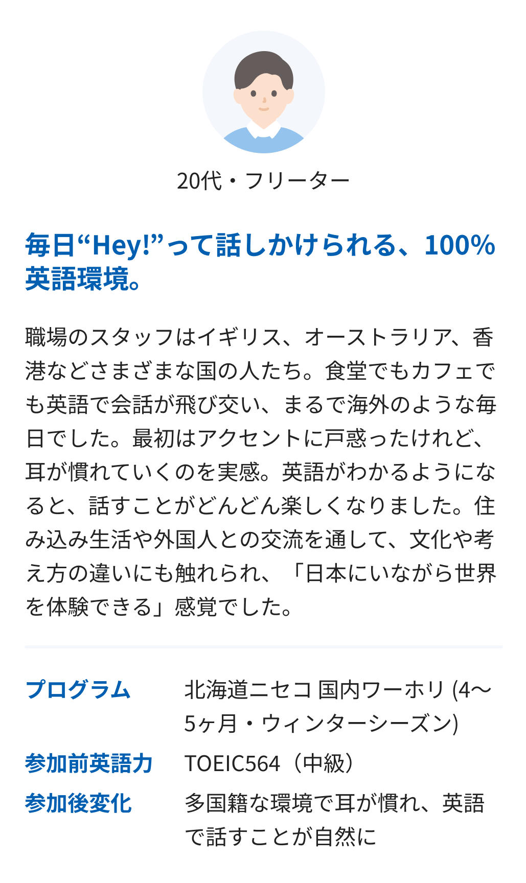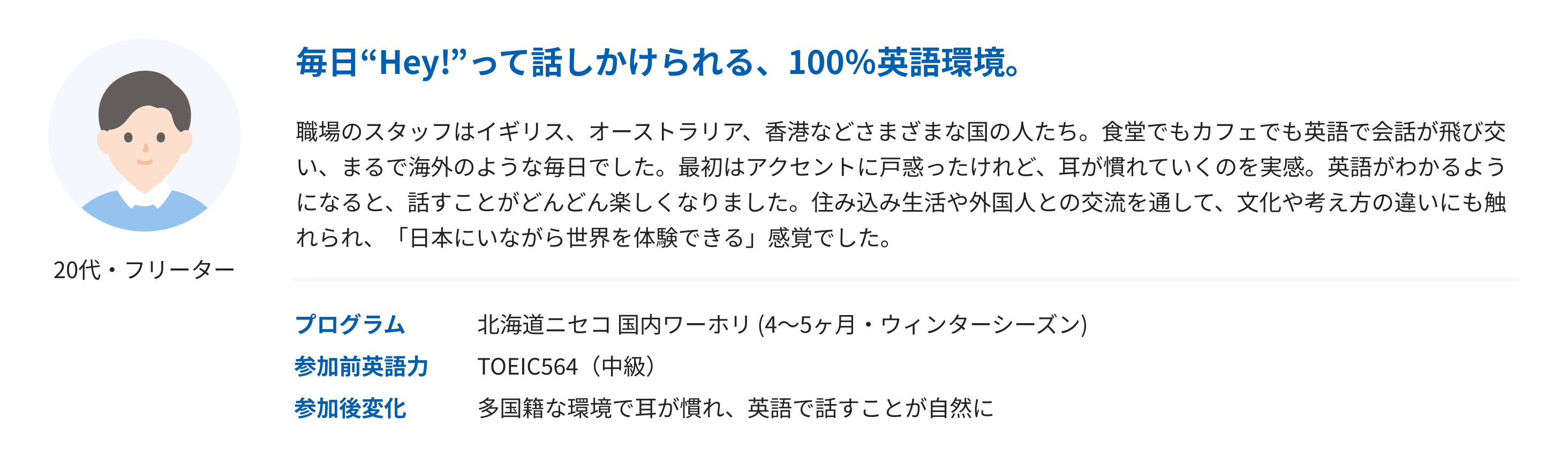 英語環境で働く経験を、最も確実に、最も手軽に得られる選択肢です。
