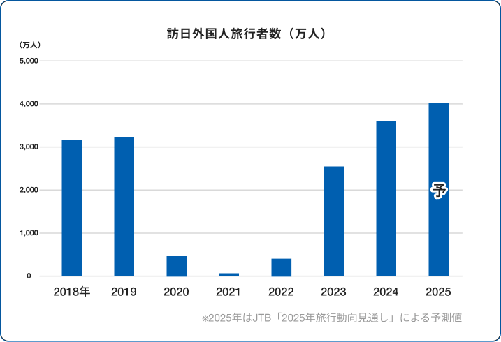 2024年のインバウンド(訪日外国人)数は、コロナ禍前の2019年(3,188万人)を上回り、3,687万人に達すると見込まれており、海外からの訪日客が伸びている傾向は今後も続くと予想されています。